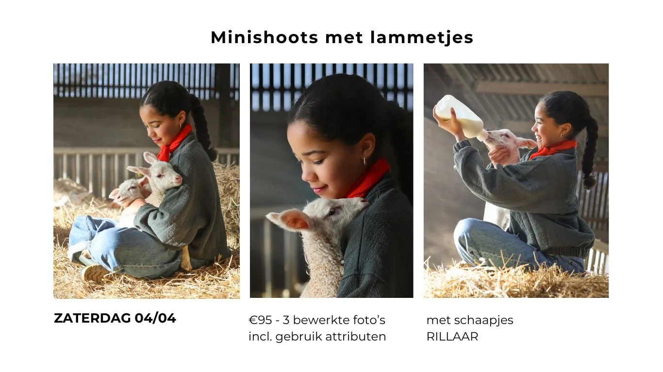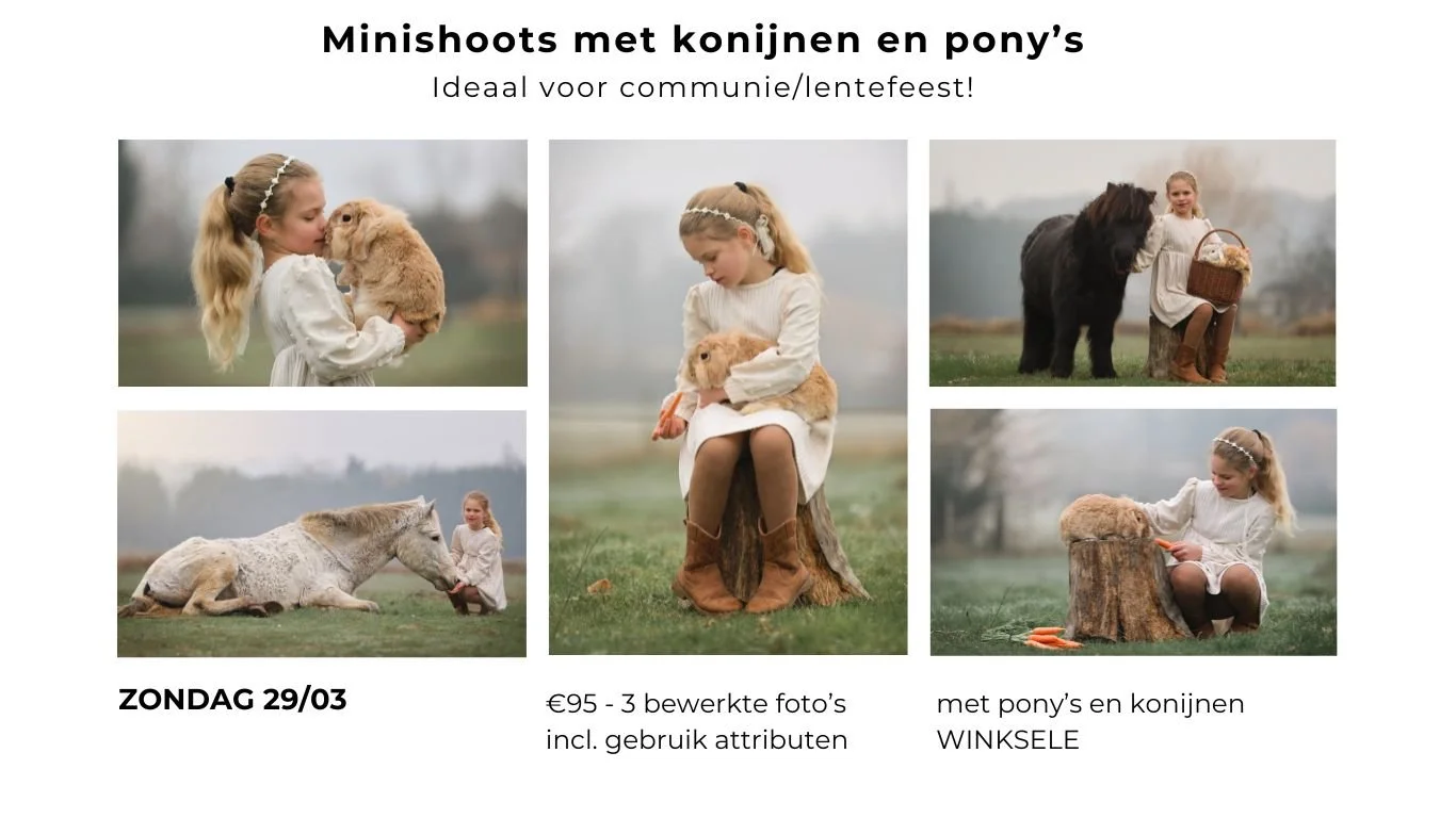 Hieronder vind je de komende minishoots met dieren. Deze zijn ideaal voor lentefeest of communiefoto’s. Let op, de plekjes zijn beperkt om de rust van de dieren te waarborgen.